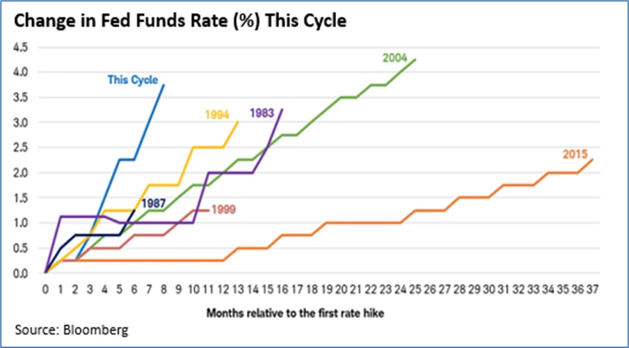 2022 was the worst year for the stock market since 2008, and the worst year for the bond market since the 1930s. Going into the year the Federal Funds Rate was 0%, and the Federal Reserve thought that inflation was transitory. During the year the Fed realized their transitory thesis was wrong, and they hiked rates at a historic pace to get to 4.25% (see chart below). Further, the war in Ukraine, which started in late February, made the Fed’s job to get inflation under control more difficult with increasing fuel and food prices. The conflict also introduced even more economic uncertainty with the first European land conflict since the 1930’s. Stocks and bonds have been repriced for these higher rates and greater economic uncertainty. While we are likely near the end of the rate hikes, their impact on the economy will take time to become evident.