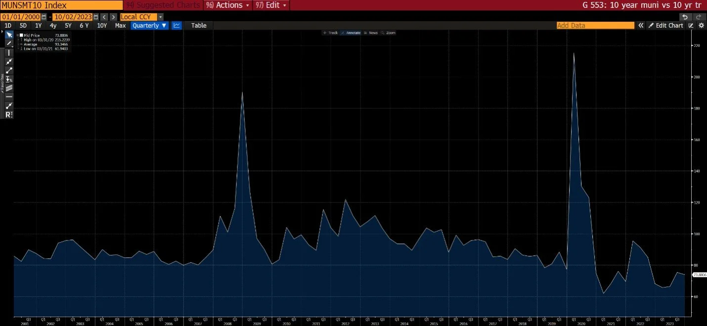 Currently, municipal bonds are offering yields at 78% of their Treasury counterparts, which falls within the lower range of historical trends. While it's challenging to pinpoint the exact reason, some may attribute this to a flight to quality. Regardless, considering the broader interest rate context, their stability is noteworthy. For example, the 20–30-year Treasury bonds have declined over 12% year-to-date, including dividends. The MUB ETF has seen a modest decline of -1.8%, including dividends.