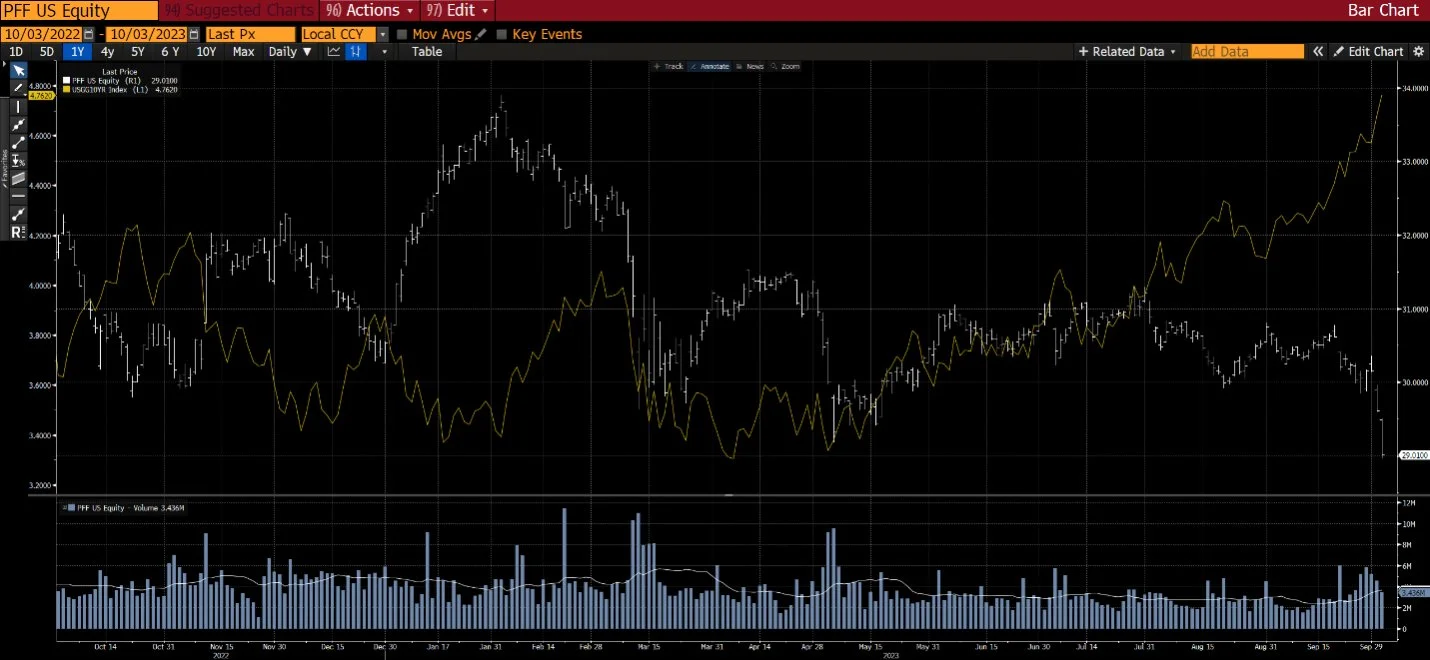 Source: Bloomberg BVAL, 'PFF US Equity from October 3, 2022, to October 3, 2023,' accessed October 2, 2023.