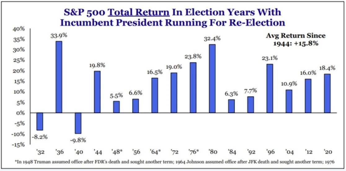 As shown above, the S&P 500 has increased in each of the past 13 presidential re-election years as presidents like to prime the economy in order to minimize any economic fallout and maximize their re-election chances.