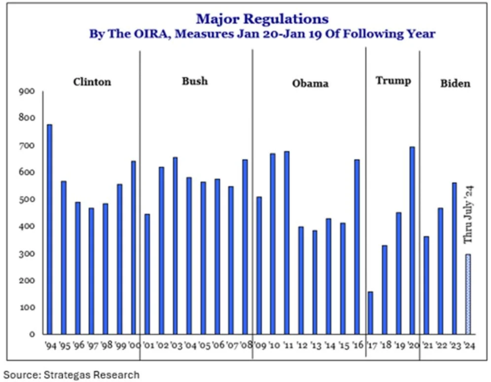 Much has been written on regulatory policies under different administrations. Interestingly, the Office of Information and Regulatory Affairs (OIRA) shows that regardless of which president is in office or what party they are from, the number of policies and regulations implemented under a president appears to be high. We want to understand how different policies will affect economic growth and profits for different industries and companies.
