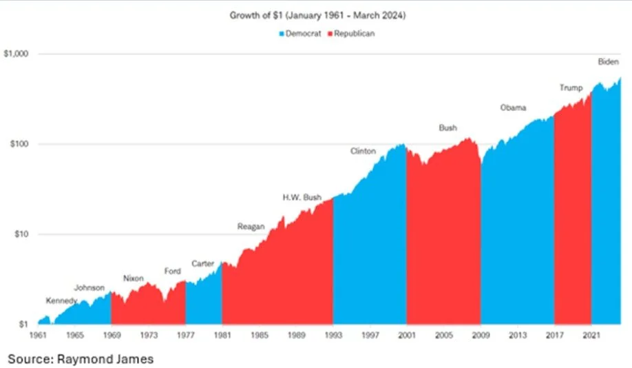 We want to share a final and arguably most important piece of data: history shows that regardless of who wins, the stock market tends to do well regardless. Looking back at every election since 1961 (see chart below), you can rest assured that whether the White House is red or blue makes little to no difference to long term equity returns. We believe that the stock market's performance is more influenced by the overall health of the economy and Fed policy rather than the sitting president. Factors such as corporate earnings, interest rates, and global economic conditions play significant roles, and this is where we focus our time and attention, despite the media headlines trying to distract us. It’s very easy to get carried away in the respective candidate’s platforms, but being stewards of history, we realize that other factors are much more important over time, and they will drive the eventual outcome of a successful investment strategy.
