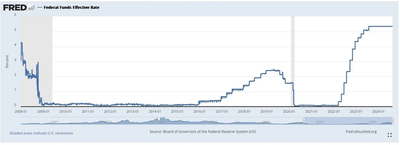 The federal funds rate went from 0.25% to over 5.00% within just 12 months- the fastest pace of rate increases since the early 1980s.