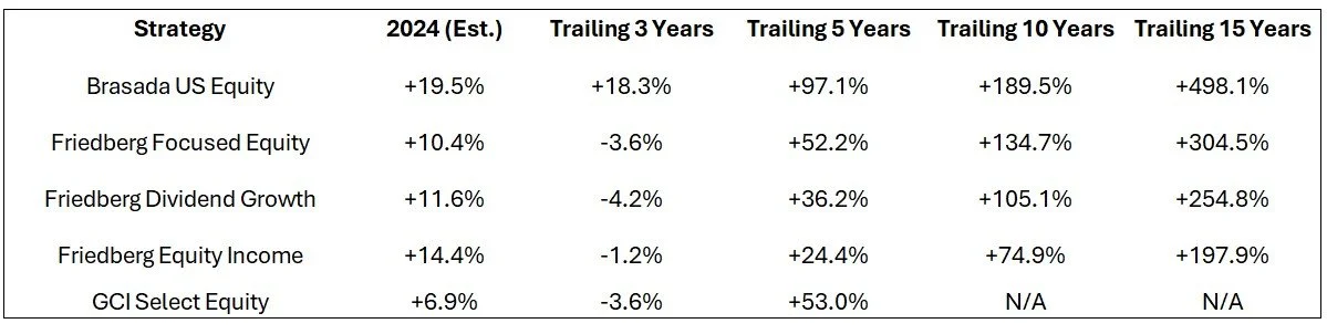 Our equity strategy returns, net of fees, are shown below. Our composite returns are audited each year and returns for 2024 are estimated. These are shown in accordance with the Global Investment Performance Standards, and your own returns may be different than these as our portfolios are customized: