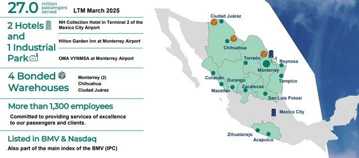OMAB is one of three publicly traded airport operators in Mexico. They operate 13 international airports under long-dated concessions (50-year term into 2048). They make money from regulated air travel services (passenger charges, landing/parking, etc.) and higher-margin commercial activities (parking, food & beverage, retail, lounges, cargo/logistics). They are levered directly to passenger volumes and tariff settings. The network is heavily concentrated in Monterrey, Mexico which is over 40% of the total mix. Every 5 years, OMAB and the Mexican government negotiate via a Master Development Program (MDP) for the next 5-years. The MDP is a capex mandate to the operator. This requires them to expand terminals, improve runways/taxiways, and add equipment.